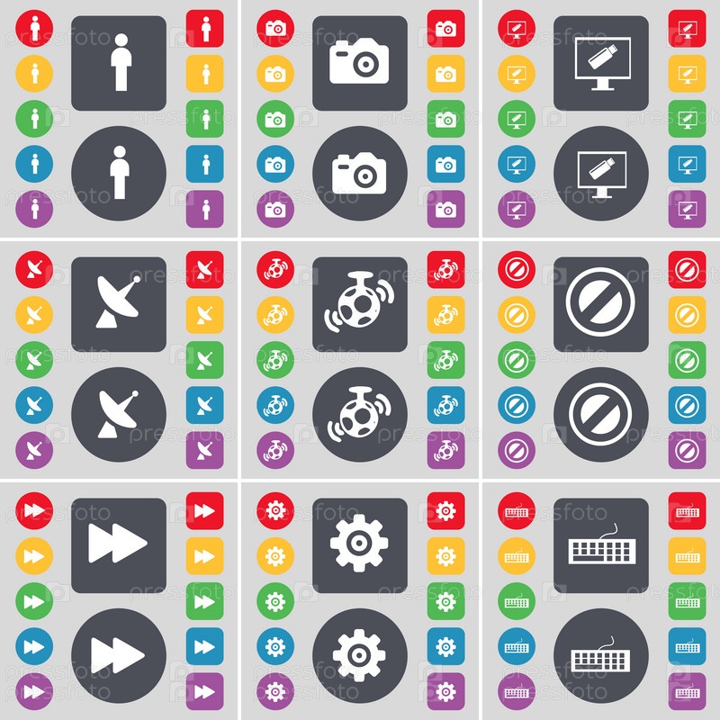 Силуэт, Камера, монитор, Спутниковая тарелка, спикер, остановки, перемотки, снаряжение, символ значок Клавиатура. Большой набор плоских, цветные кнопки для вашего дизайна. Вектор