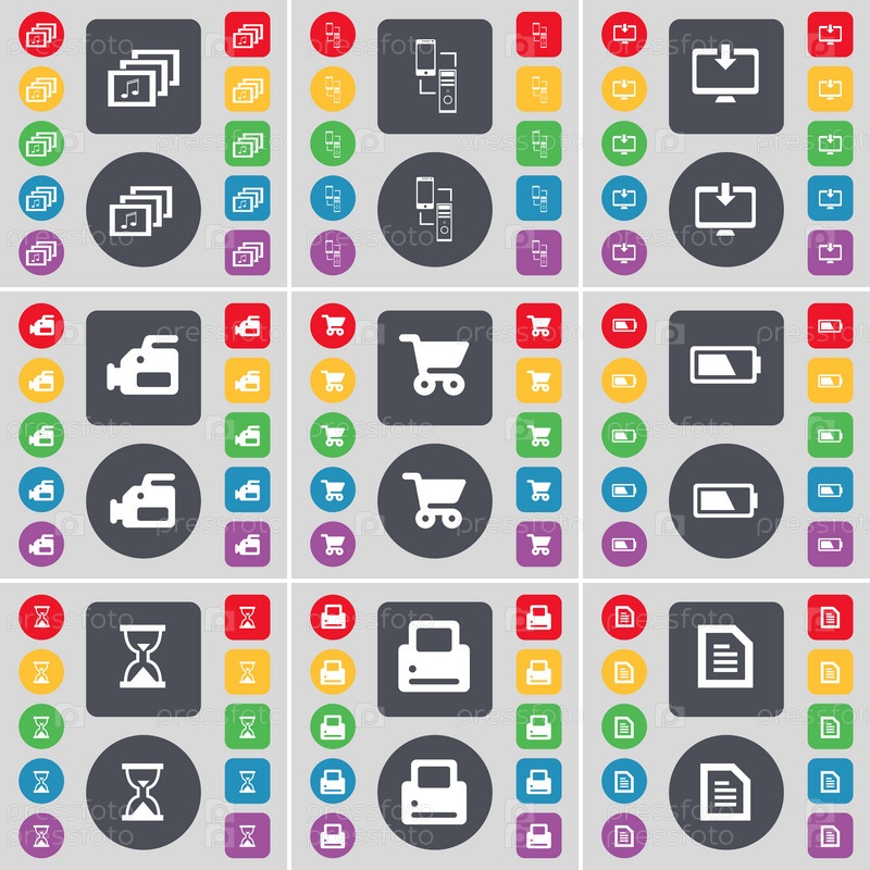 Галерея, связи, монитор, пленочной камеры, корзина, батарея, Песочные часы, принтер, текст файла значок символа. Большой набор плоских, цветные кнопки для вашего дизайна. Вектор