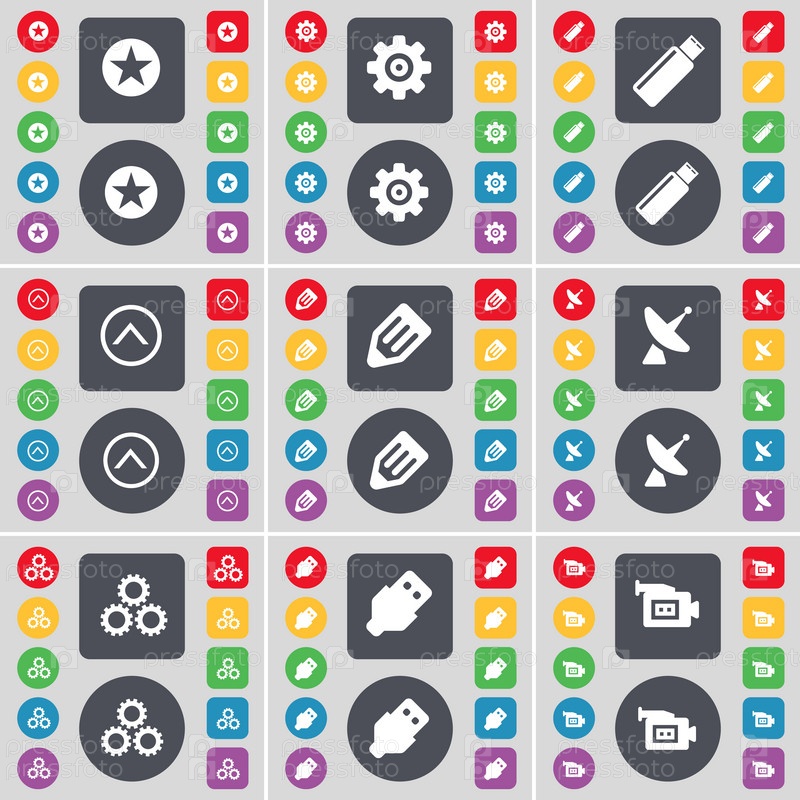 Звезда, снаряжение, USB, стрелка вверх, карандаш, спутниковая тарелка, оборудование, USB, кинокамера значок символа. Большой набор плоских цветных кнопок для вашего дизайна. вектор