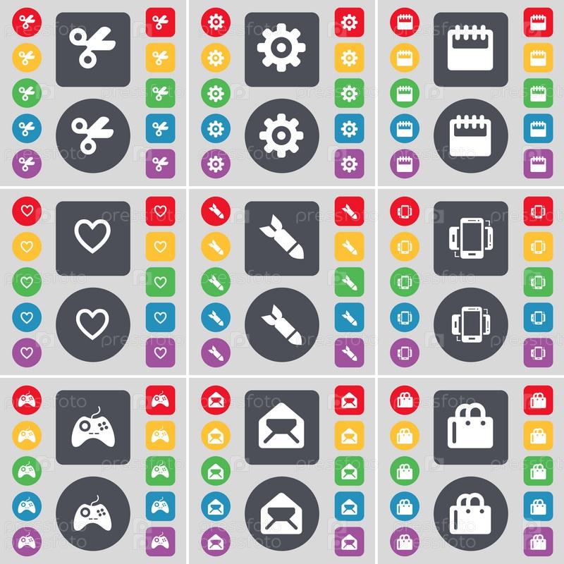 Ножницы, Гир, календарь, сердце, ракета, смартфон, геймпад, сообщение, торговая сумка значок символа. большой набор плоских цветных кнопок для вашего дизайна. вектор