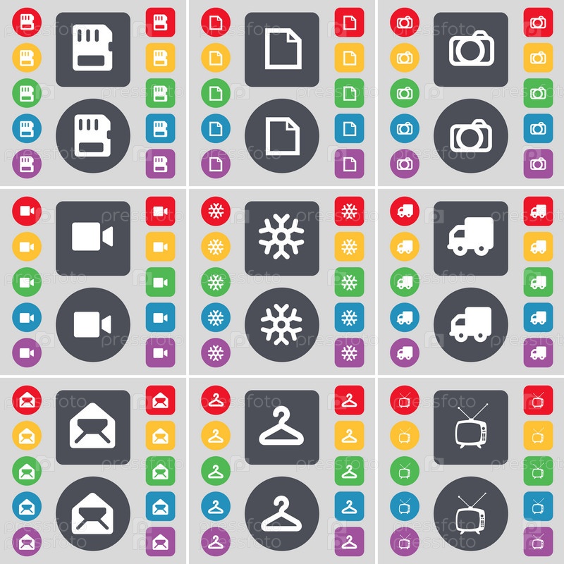 SIM-карта, файл, камера, пленочная камера, снежинка, грузовик, сообщение, вешалка, Retro TV значок символа. большой набор плоских цветных кнопок для вашего дизайна. вектор