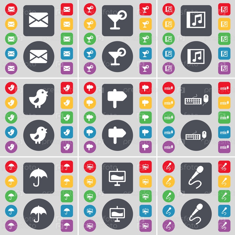 Сообщение, коктейль, музыкальные окна, птица, указатель, клавиатура, значок символа Umbre. большой набор плоских цветных кнопок для вашего дизайна. вектор