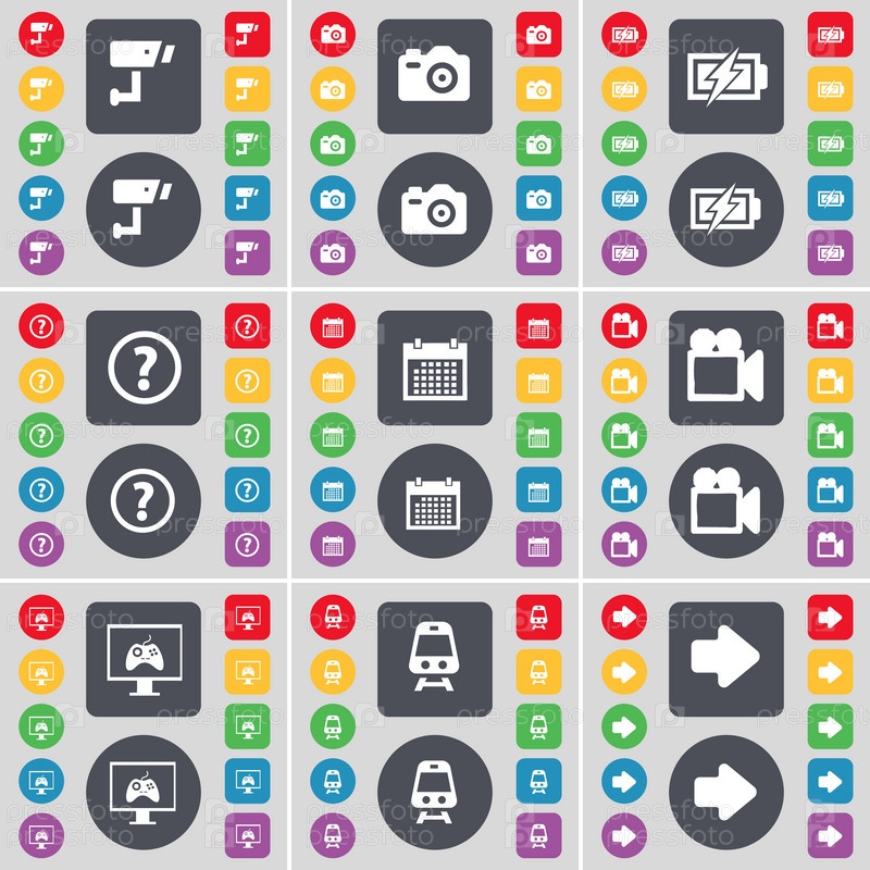 Видеонаблюдение, камеры, зарядка, вопросительный знак, календарь, пленочной камеры, монитора, поезд, правая Иконка Стрелка. Большой набор плоских, цветные кнопки для вашего дизайна. Вектор