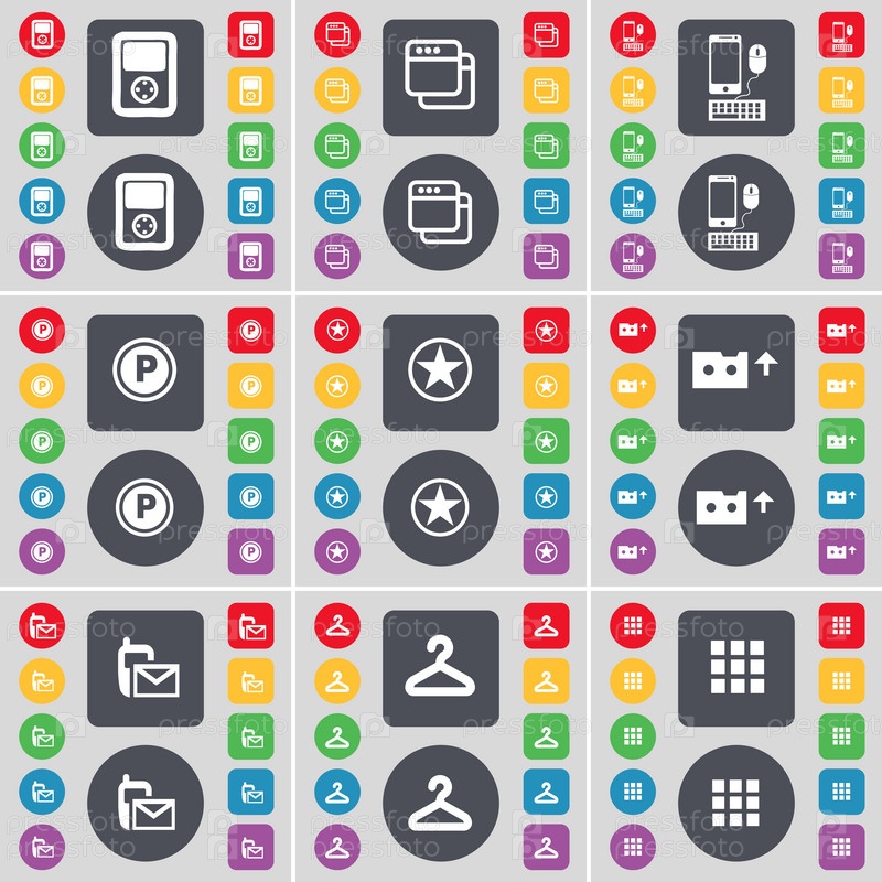 Игрок, окна, смартфон, парковка, звезда, кассеты, SMS-сообщения, вешалки, значок символа иконы приложения. Большой набор плоских цветных кнопок для вашего дизайна