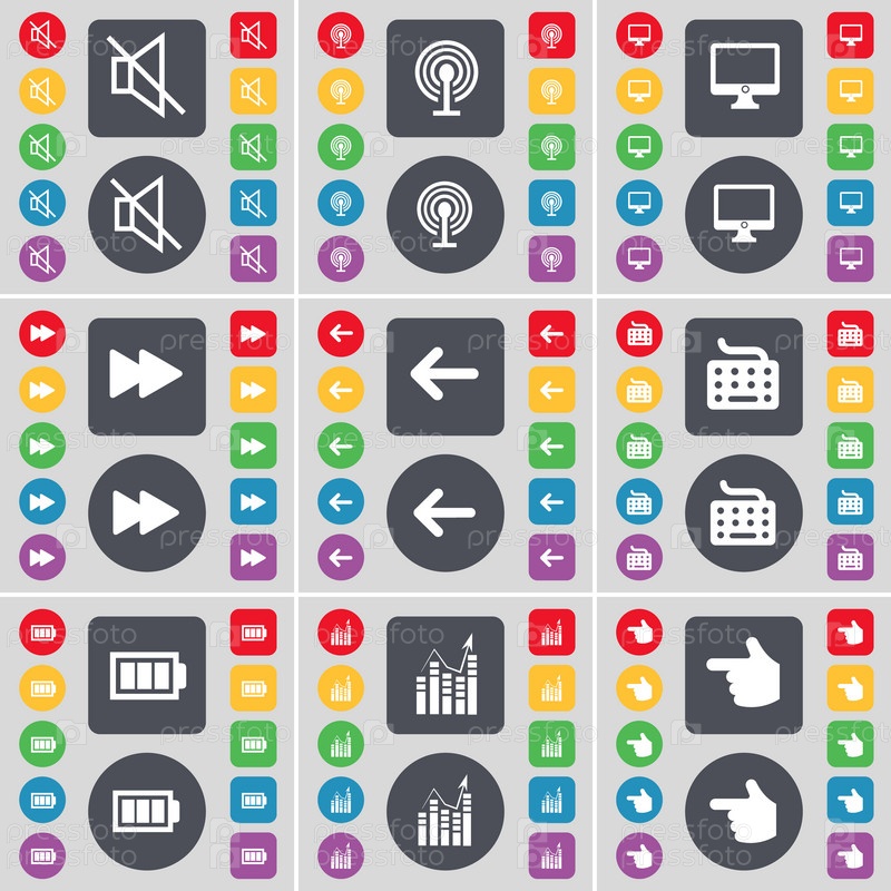 Безмолвный, Wi-Fi, монитор, повернуть назад, стрелка влево, клавиатура, батарея, граф, символ значка руки. большой набор плоских цветных кнопок для вашего дизайна. вектор
