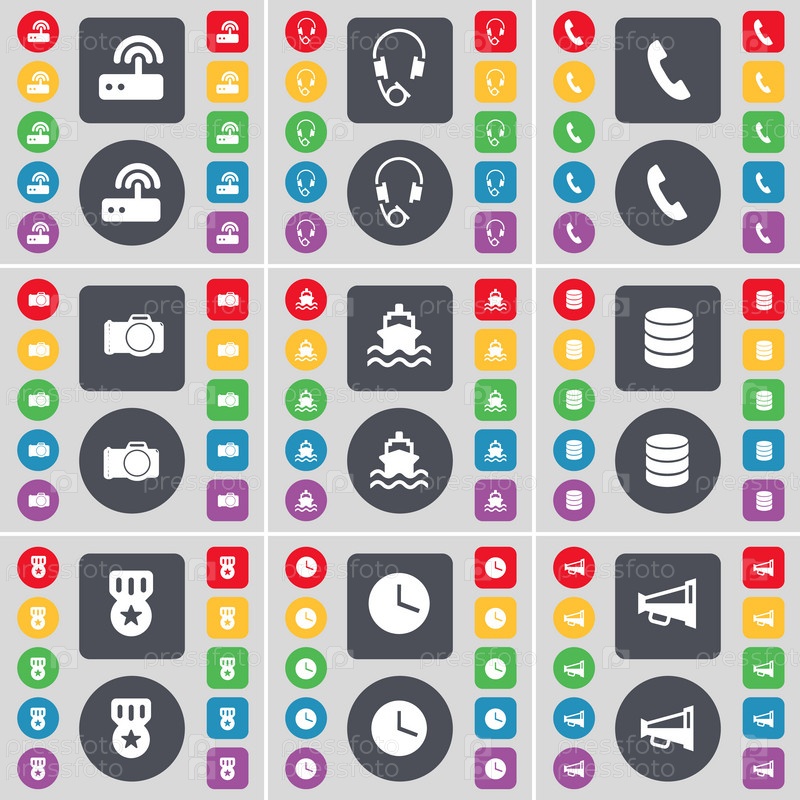 Маршрутизатор, наушники, приемник, камеры, корабль, базы данных, медаль, часы, Мегафон значок символа. Большой набор плоских, цветные кнопки для вашего дизайна. Вектор