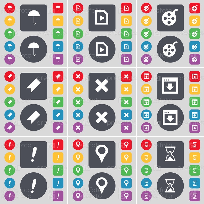 Зонты, средства массовой информации играют, видеозапись, маркер, остановки, окна, восклицательный знак, контрольно-пропускной пункт, Песочные часы значок символа. Большой набор плоских, цветные кнопки для вашего дизайна. Вектор