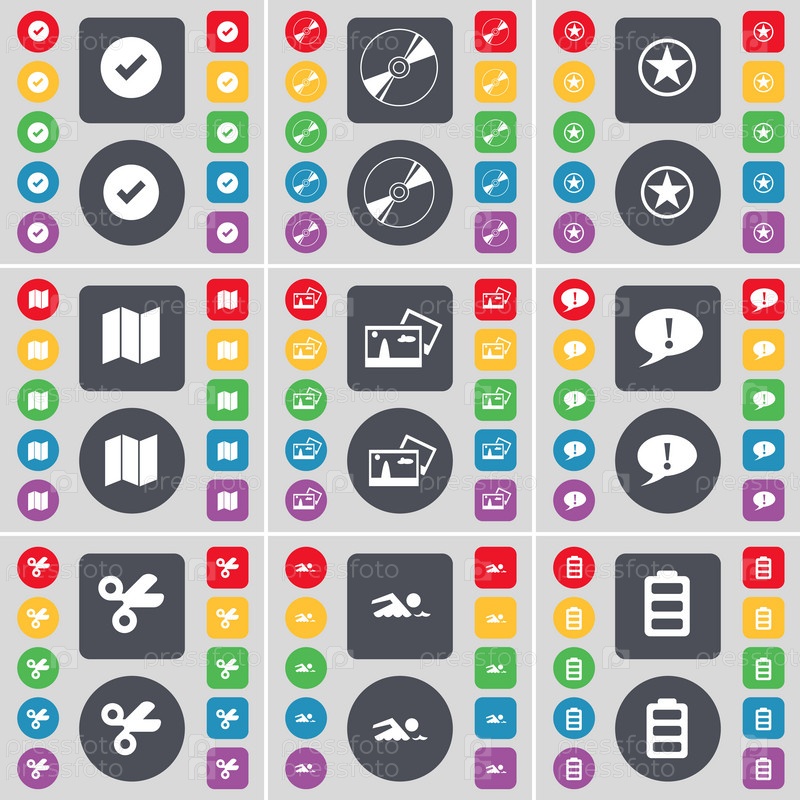 Отметьте, диск, звезды, карта, фотография, чат пузырь, ножницы, пловец, значок символ батареи. Большой набор плоских, цветные кнопки для вашего дизайна. Вектор