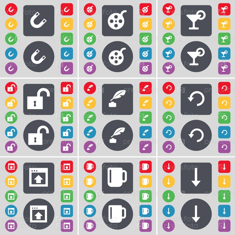 Магнит, видеозапись, коктейль, замок, чернила перо, перезагрузка, окно, Кубок, стрелка вниз значок символа. Большой набор плоских, цветные кнопки для вашего дизайна. Вектор