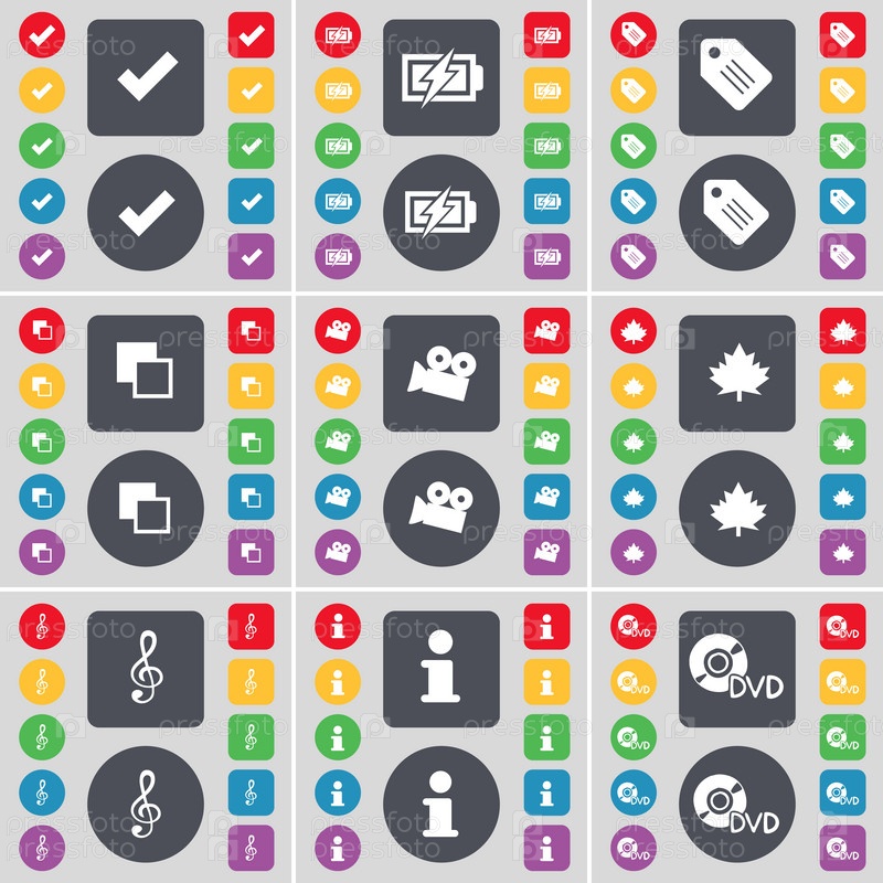 Тик, зарядные устройства, теги, копирование, пленочная камера, клеп-лист, скрипичный ключ, информация, значок символа DVD. Большой набор плоских цветных кнопок для вашего дизайна. вектор