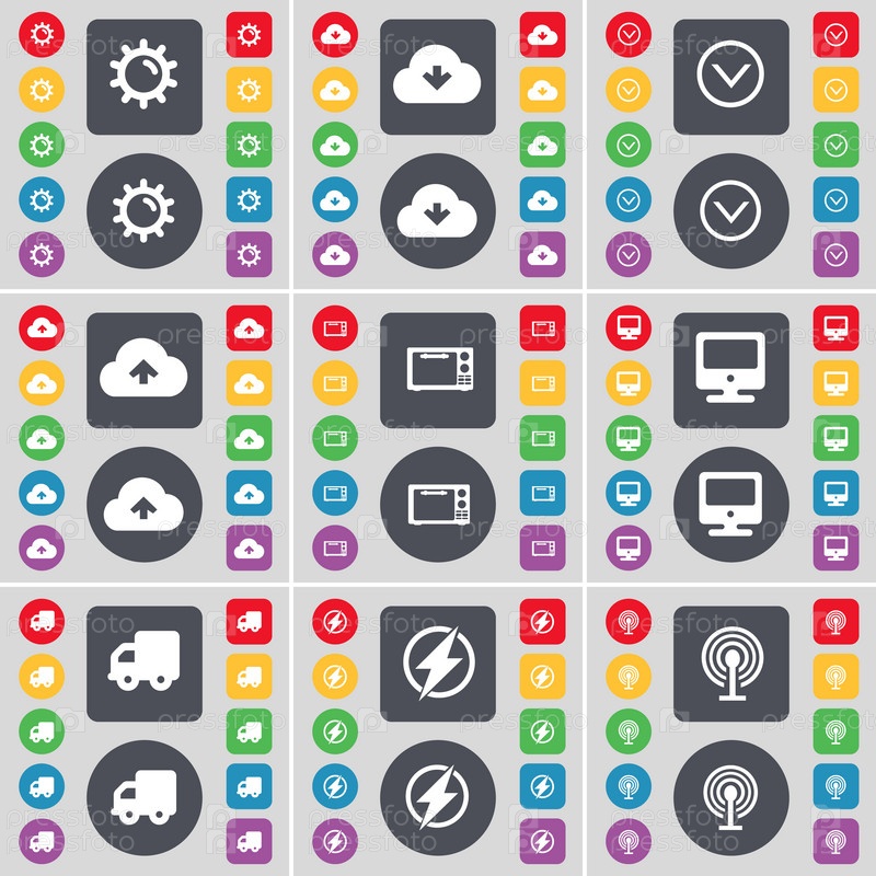 Передатчик, облако, стрелка вниз, микроволновая печь, монитор, грузовик, Флэш, значок символа Wi-Fi. большой набор плоских цветных кнопок для вашего дизайна. вектор