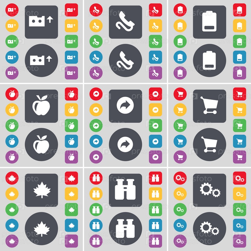 Кассета, приемник, батарея, обратно, яблоко, корзина, кленовый лист, бинокли, значок шестеренка. Большой набор плоских, цветные кнопки для вашего дизайна. Вектор