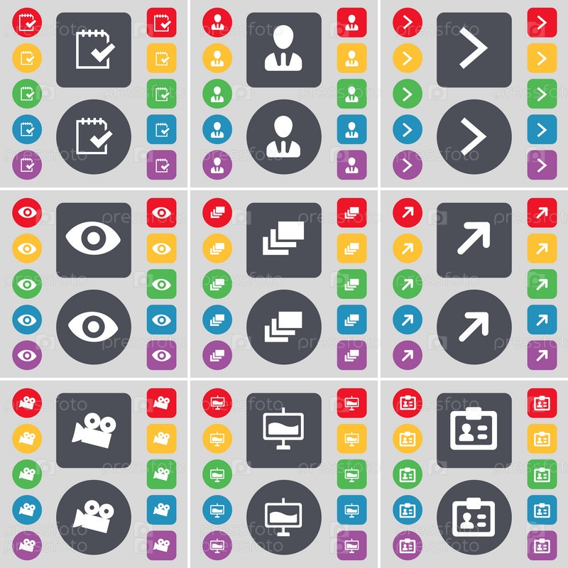 Обследования, аватар, стрелка вправо, видение, галерея, полный экран, пленочной камеры, граф, символ значок контакта. Большой набор плоских, цветные кнопки для вашего дизайна. Вектор