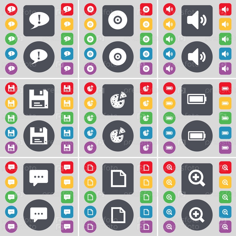 Чат пузырь, диск, звук, флоппи, пицца, батареи, чат пузырь, файл, увеличительное стекло значок символа. Большой набор плоских, цветные кнопки для вашего дизайна. Вектор