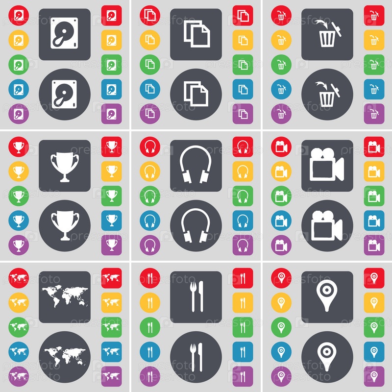 Жесткий диск, копия, мусор может, Кубок, наушники, глобус, вилку и нож, контрольно-пропускной пункт значок символа. Большой набор плоских, цветные кнопки для вашего дизайна. Вектор