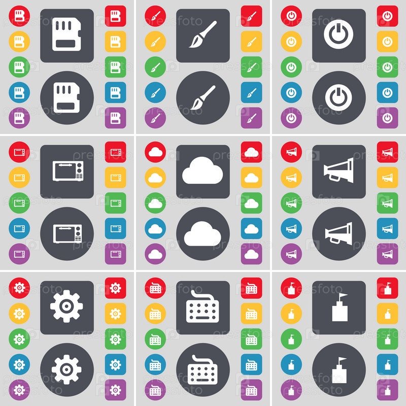 SIM-карты, кисти, мощность, микроволновая печь, облако, Мегафон, оборудование, клавиатуры, флаг башни значок символа. Большой набор плоских цветных кнопок для вашего дизайна. вектор