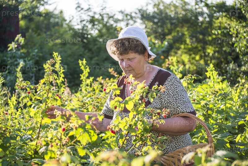 Пожилая женщина, сбора малины в саду