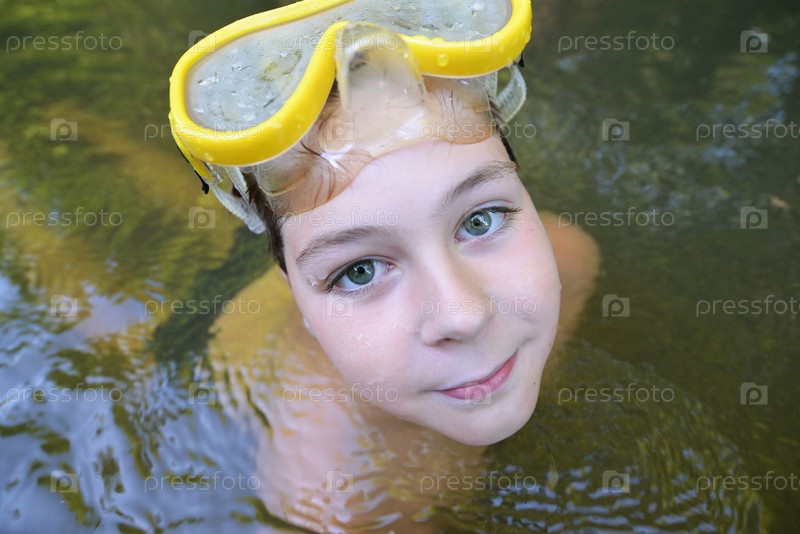 Мальчик подросток плавает в реке летом