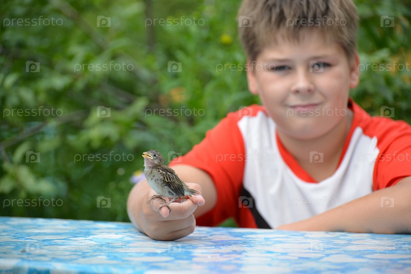Мальчик держит воробья