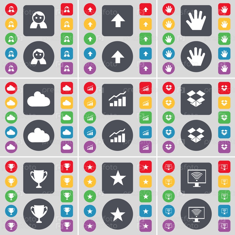 Аватар, стрелка вверх, руки, облако, граф, Dropbox, Кубок, звезда, монитор значок символа. большой набор плоских цветных кнопок для вашего дизайна. вектор