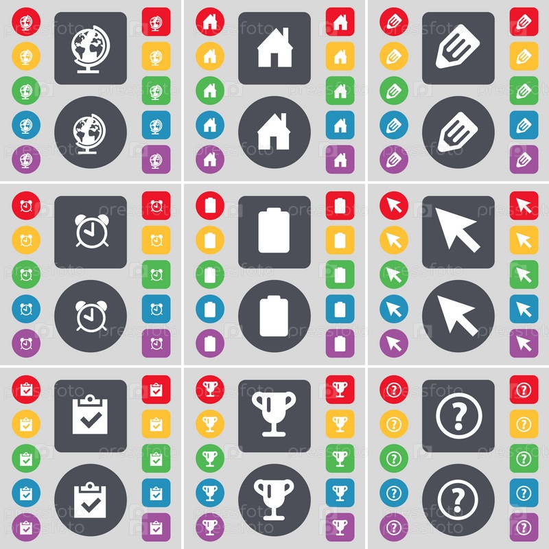 Глобус, дом, карандаш, Будильник, батарея, курсора, обследования, Кубок, значок символ вопросительного знака. Большой набор плоских, цветные кнопки для вашего дизайна. Вектор