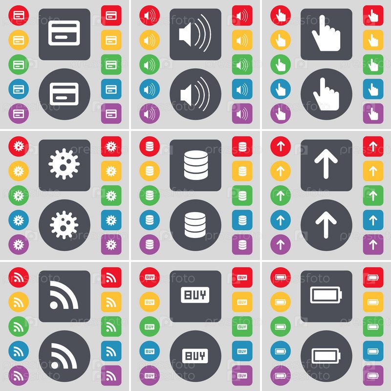 Кредитная карта, звук, рука, оборудование, базы данных, стрелка вверх, RSS, Купить, значок символа батареи. Большой набор плоских цветных кнопок для вашего дизайна. вектор