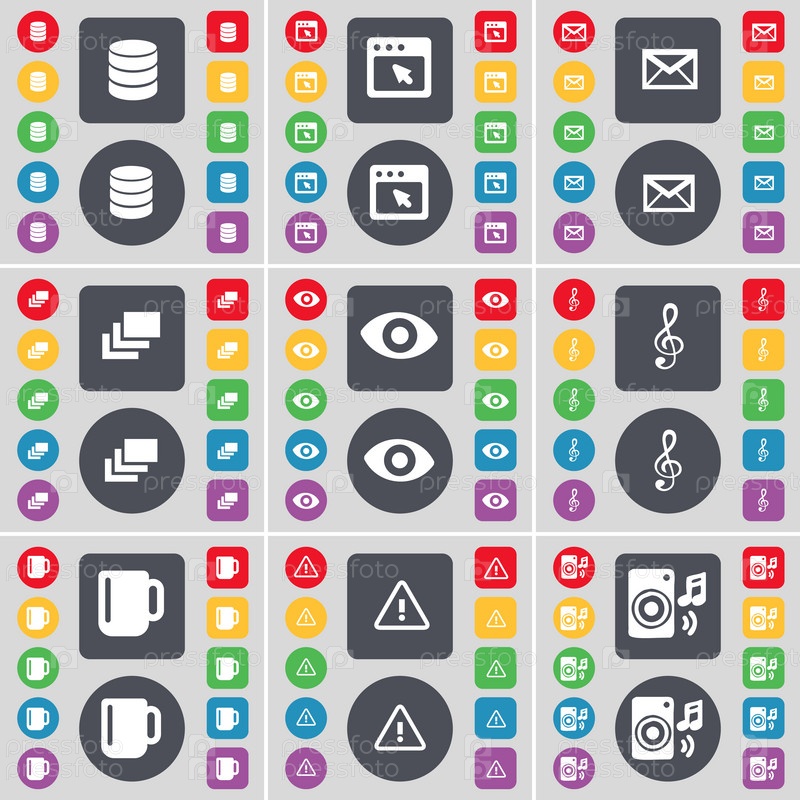 Базы данных, окна, сообщение, галерея, видение, скрипичный ключ, Кубок, предупреждение, Спикер Иконка символ. Большой набор плоских, цветные кнопки для вашего дизайна. Вектор