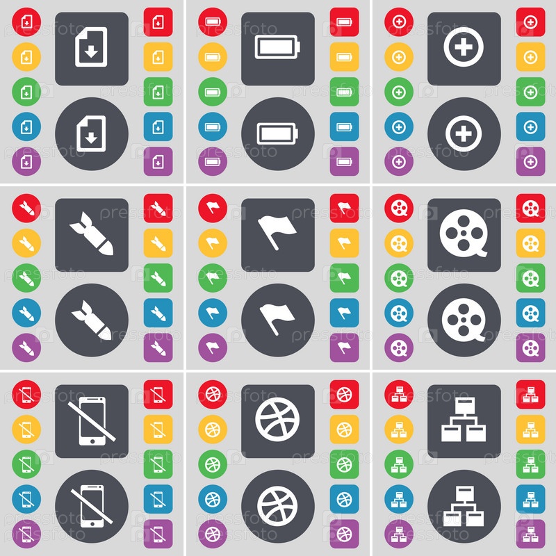 Скачать файл, батарея, плюс, ракета, флаг, видеозапись, смартфон, мяч, символ значок сети. Большой набор плоских, цветные кнопки для вашего дизайна. Вектор