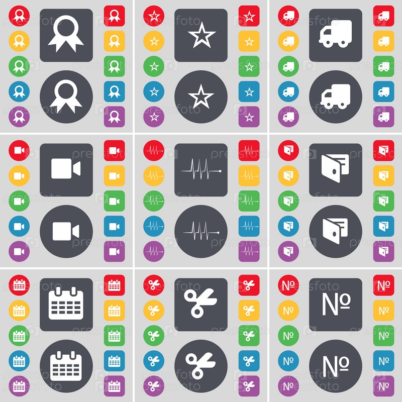 Медаль, звезда, грузовик, пленочной камеры, пульс, бумажник, календарь, ножницы, номер значок символа. Большой набор плоских, цветные кнопки для вашего дизайна. Вектор