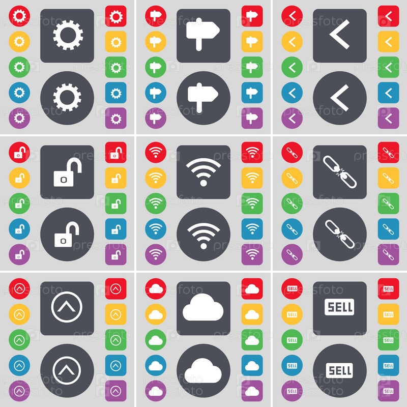 Оборудование, указатель, стрелка влево, замок, Wi-Fi, ссылка, стрелка вверх, облако, продажа значка символа. большой набор плоских цветных кнопок для вашего дизайна. вектор