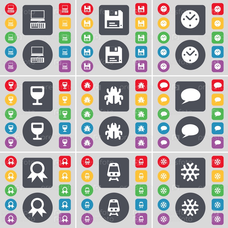 Ноутбук, флопи, часы, Wineglass, ошибка, чат-пузырь, медаль, поезд, символический значок снежинки Большой набор плоских цветных кнопок для вашего дизайна. вектор