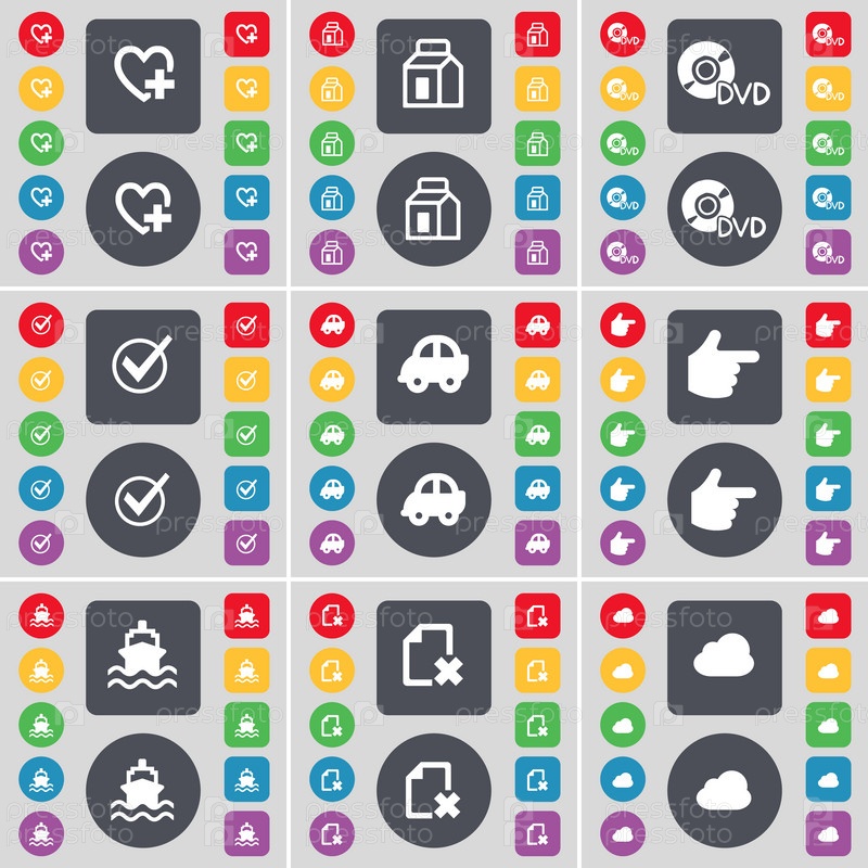 Сердце, упаковка, DVD, тик, автомобиль, рука, корабль, файл, значок символа облако. большой набор плоских цветных кнопок для вашего дизайна. вектор