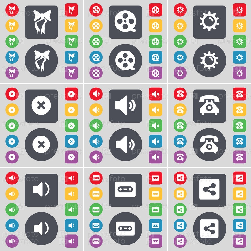 Лук, видеозапись, снаряжение, стоп, звук, ретро телефон, звук, кассеты, доля значок символа. Большой набор плоских, цветные кнопки для вашего дизайна. Вектор