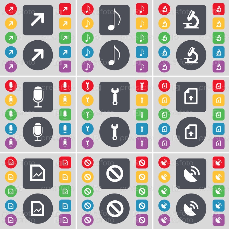 Полный экран, Примечание, Микроскоп, микрофон, гайковерт, загрузить файл, граф, стоп, Спутниковая тарелка значок символ. Большой набор плоских, цветные кнопки для вашего дизайна. Вектор