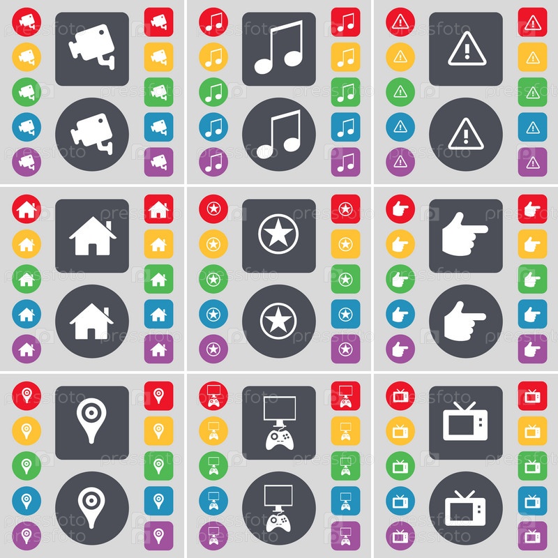 CCTV, замечание, предупреждение, дом, звезда, рука, контрольно-пропускной пункт, ноутбук, символ значка ретро ТВ. Большой набор плоских цветных кнопок для вашего дизайна. вектор