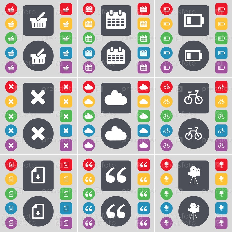Корзина, календарь, батарея, стоп, облако, велосипедов, скачать файл, кавычки, фильм камеры значок символа. Большой набор плоских, цветные кнопки для вашего дизайна. Вектор