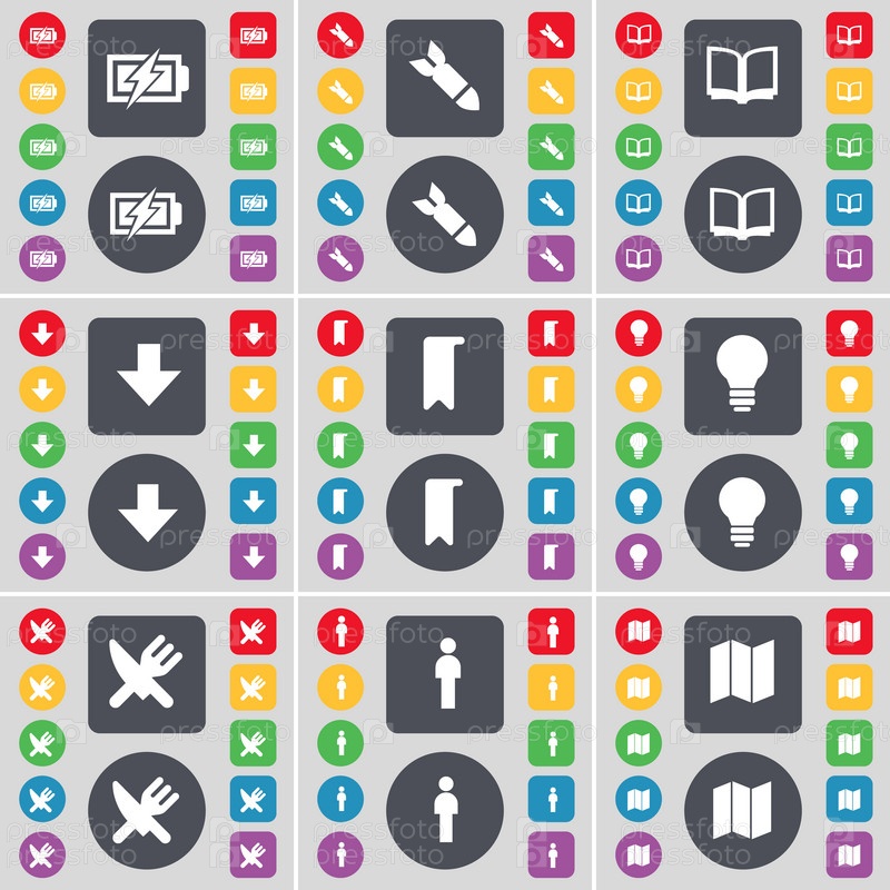 Зарядки, ракета, книга, стрелка вниз, маркер, лампочки, вилку и нож, силуэт, карта значок символа. Большой набор плоских, цветные кнопки для вашего дизайна. Вектор