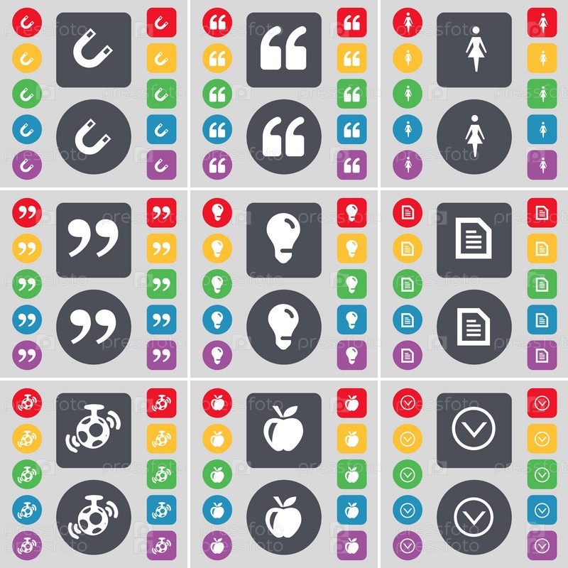 Магнит, кавычки, силуэт, кавычки, свет лампы, текстовый файл, спикер, яблоко, стрелка вниз значок символа. Большой набор плоских, цветные кнопки для вашего дизайна. Вектор