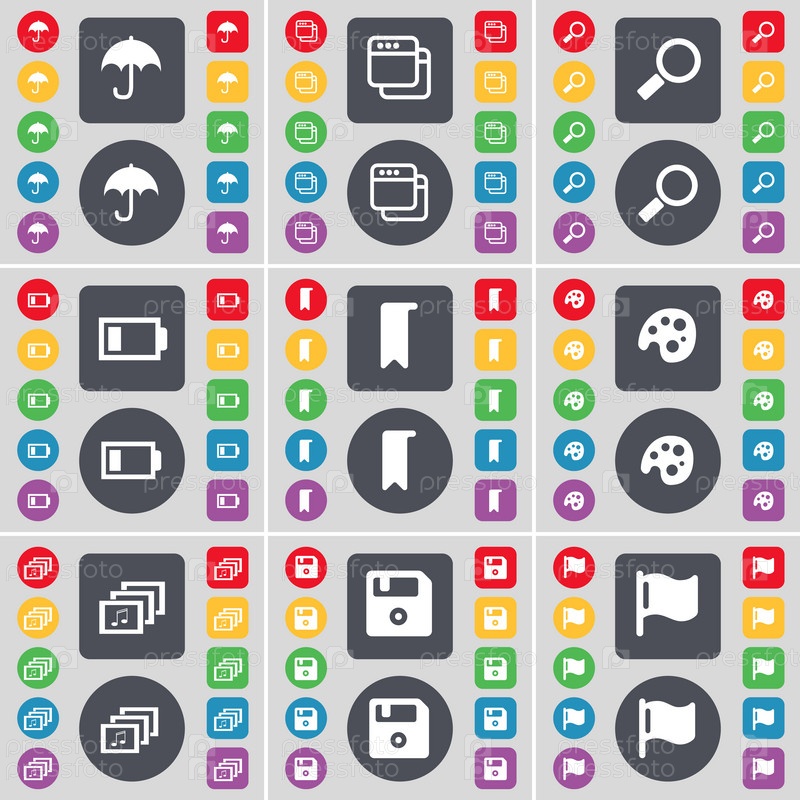 Зонтик, окна, увеличительное стекло, батарея, маркер, палитра, галерея, флоппи, символ значок флага. Большой набор плоских, цветные кнопки для вашего дизайна. Вектор