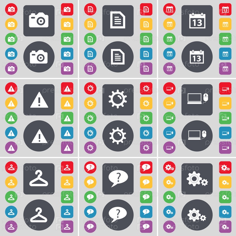 Камеры, текстовый файл, календарь, чат, предупреждение, снаряжение, ноутбук, вешалка пузырь, шестерни значок символа. Большой набор плоских, цветные кнопки для вашего дизайна. Вектор
