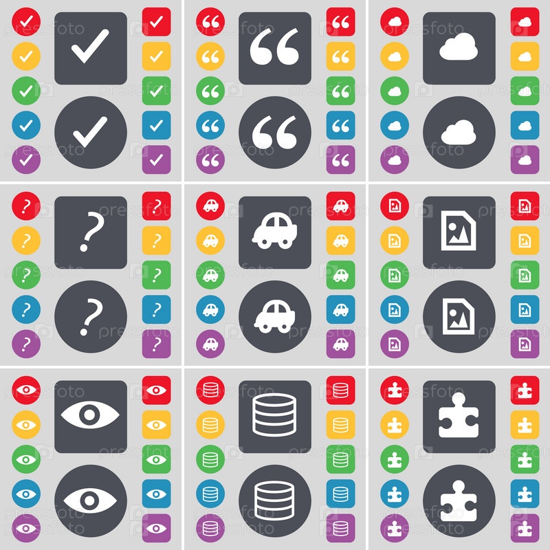 Тик, кавычки, облако, вопросительный знак, автомобилей, средства массовой информации файла, видение, базы данных, головоломки части значок символа. Большой набор плоских, цветные кнопки для вашего дизайна. Вектор