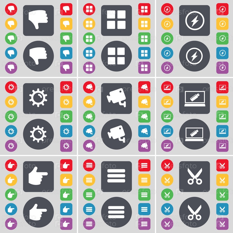 Ненависть, приложения, флэш, оборудование, видеонаблюдение, ноутбук, рука, приложения, ножницы значок символа. большой набор плоских цветных кнопок для вашего дизайна. вектор