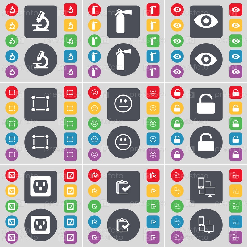Микроскоп, Огнетушитель, Визион, рама, улыбка, замок, розетка, исследования, символ значка подключения. Большой набор плоских цветных кнопок для вашего дизайна. вектор