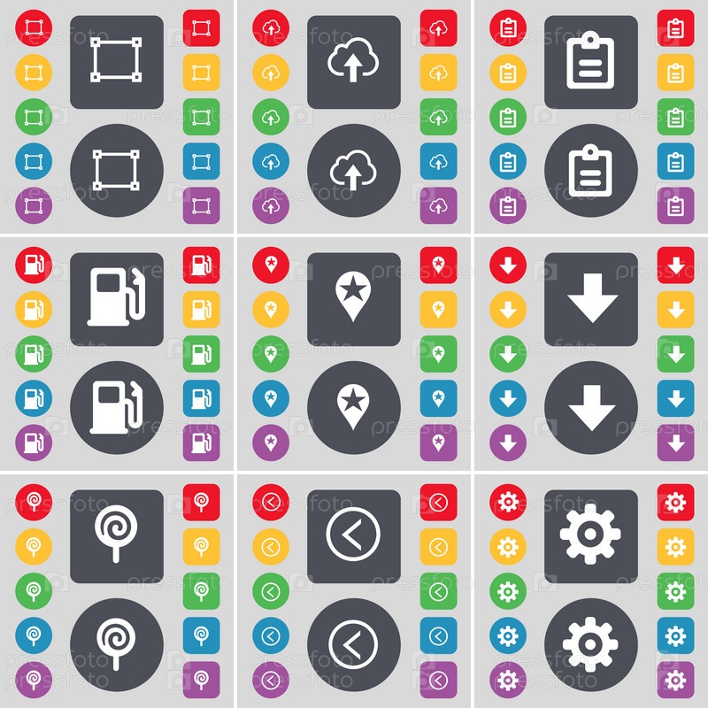 Рама, облако, обследования, автозаправочная станция, контрольно-пропускной пункт, стрелка вниз, леденец, стрелка влево, значок шестеренка. Большой набор плоских, цветные кнопки для вашего дизайна. Вектор