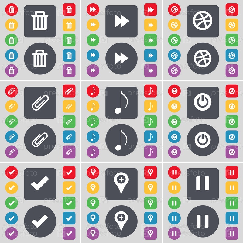 Мусорный бак, Rewind, мяч, клип, Примечание, мощности, тик, контрольно-пропускной пункт, значок символа паузы. Большой набор плоских цветных кнопок для вашего дизайна. вектор