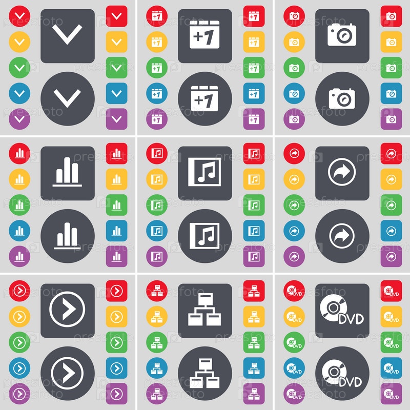 Стрелка вниз, плюс один, камера, диаграмма, музыкальное окно, назад, стрелка направо, сеть, значок символа DVD. Большой набор плоских цветных кнопок для вашего дизайна. вектор