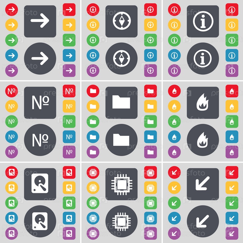 Стрелка вправо, компас, информации, число, папка, огонь, жесткий диск, процессор, развертывание экран значок символа. Большой набор плоских, цветные кнопки для вашего дизайна. Вектор