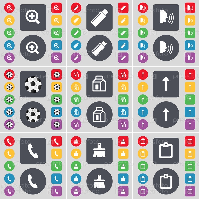 Увеличивающее стекло, USB, Talk, мяч, пакет, стрелка вверх, приемник, кисти, обследование значка символа. большой набор плоских цветных кнопок для вашего дизайна. вектор