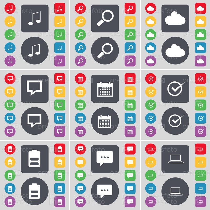 Примечание, увеличительное стекло, облако, чат пузырь, календарь, тик, аккумулятор, ноутбук значок символа. Большой набор плоских, цветные кнопки для вашего дизайна. Вектор