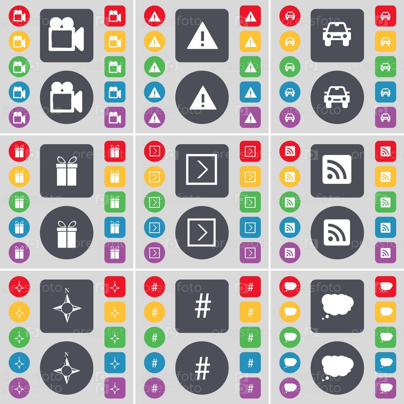 Пленочная камера, предупреждение, автомобиль, подарок, стрелка направо, RSS, компас, Hashtag, чат облака иконный символ. большой набор плоских цветных кнопок для вашего дизайна. вектор